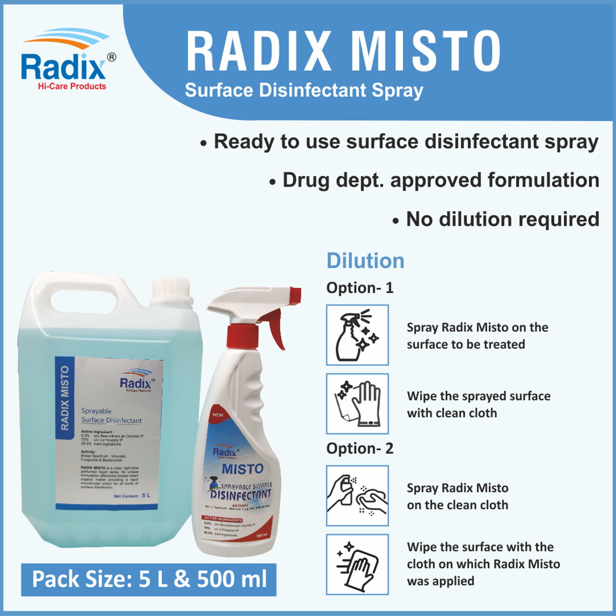 - 2x500ml and 1x5ltr RADIX MISTO: Contaminated rooms, pathology laboratories, clinic chamber, research and development laboratories…for that matter any room can pose a threat for wide spread germs and diseases. Radix Misto can help you avoid this and can be sprayed undiluted aerially or on soiled surface for that matter!
